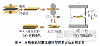 CHEN等通過累積疊軋方法對復(fù)合坯料施加高周期的塑性變形,使得石墨箔在強剪應(yīng)力作用下原位剝離分層為石墨烯,并分散在銅基體中,所制備的復(fù)合材料硬度與抗拉強度均達(dá)到退火純銅的3倍以上,原位剝離形成的石墨烯對復(fù)合材料的強度貢獻(xiàn)極高,并與基體形成了較強的界面結(jié)合。KIM等以等速常規(guī)軋制與高速率差速軋制的組合工藝獲得了高度致密的石墨烯/銅復(fù)合板料,在差速軋制剪切力的作用下基體中的石墨烯發(fā)生碎裂,形成納米石墨烯顆粒并均勻分散在基體中。KORZNIKOVA等探索了采用高壓扭轉(zhuǎn)方式制備塊體石墨烯/銅復(fù)合材料的工藝,經(jīng)過限定與非限定型兩步法高壓扭轉(zhuǎn)變形后的復(fù)合材料的硬度與純銅相比顯著提高,并且形成了心部硬度低、邊緣硬度高的梯度分布;在扭轉(zhuǎn)過程中石墨烯得到細(xì)化并分散在晶界處形成釘扎作用,復(fù)合材料脆性斷裂特征明顯,表現(xiàn)出類似陶瓷材料的超高硬度、低強度與低塑性的特征。