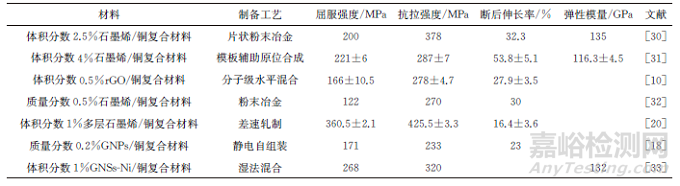 表1 不同工藝制備得到不同石墨烯增強銅基復(fù)合材料的力學(xué)性能