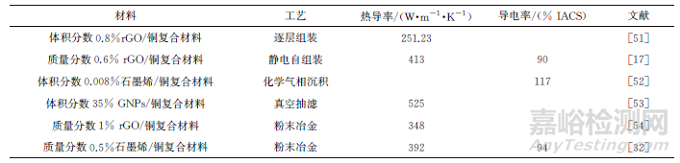 表2 不同工藝制備得到不同石墨烯增強銅基復(fù)合材料的導(dǎo)電和導(dǎo)熱性能