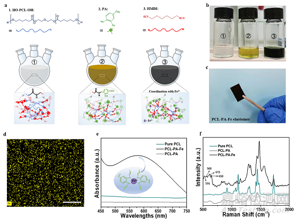 為了制備該彈性體材料,作者主要考慮了兩個因素。一、選擇PCL作為聚合物骨架。PCL是一種可降解的、具有良好生物相容性的聚合物。此外,它的易結晶性使其能夠在材料拉伸過程中構建結晶區(qū)來延遲材料本體的斷裂,提高材料性能。二、選擇Fe3+與原兒茶醛(PA,擴鏈劑)配位相互作用作為動態(tài)交聯點。Fe3+與PA的配位相互作用具有高強度、生物相容性和易制備性,可以在保留聚合物的加工性的同時提供高其力學性能。最終,作者獲得了一種具有高強度、可回收且可降解的PCL基聚氨酯彈性體(PCL-PA-Fe)。整個合成如圖1所示。