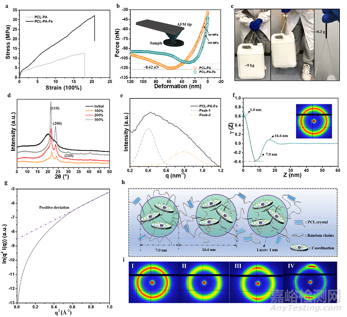 首先,作者對所制備的材料進行了結構和性能表征(圖2)。由于強配位鍵的存在,相較于無配位結構的彈性體PCL-PA,PCL-PA-Fe的力學性能有了明顯的提升。AFM測試結果也說明材料強度在引入配位鍵后明顯增強。為了進一步分析其良好的機械性能,作者對材料進行了XRD和SAXS的結構表征,發(fā)現材料中存在相分離結構且還存在少量的PCL小結晶,在拉伸過程中,相分離結構會被破壞,其中主要包括分子鏈的解纏,配位鍵硬段團簇以及原始的PCL小結晶結構的破壞,隨著拉伸形變的增大,彈性體的應變誘導結晶程度逐步增強,取向結構更加明顯,因此具有強大的能量耗散體系。
