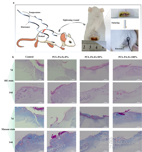 最后,PCL-PA-Fe具有良好的生物相容性,可以應用在傷口修復上。作者以小鼠作為實驗模型,以PCL-PA-Fe彈性體線作為手術線,并對小鼠的傷口恢復情況進行了檢查。從第7天和第14天的組織樣本可以看出,第7天PCL-PA-Fe縫合的傷口均結痂并且痂下形成了完整的表皮,而對照組醫(yī)用縫合線(天然蠶絲)縫合的傷口還未形成完整表皮,并且能看到傷口處的斷裂,還未完全被膠原纖維填充;第14天所有組傷口都已愈合,但是PCL-PA-Fe手術線組新生皮膚更加平整,膠原纖維排列也更加致密規(guī)則。這說明使用PCL-PA-Fe縫合能夠促進傷口愈合,使縫合更加緊湊。