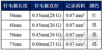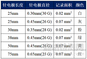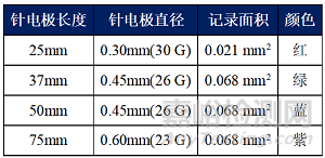 為不同尺寸的肌肉設(shè)計(jì)不同的針,并用不同的顏色進(jìn)行區(qū)分;不同的顏色的電極針在直徑、長(zhǎng)度與記錄面積上參數(shù)與規(guī)格不同,共有四種型號(hào):