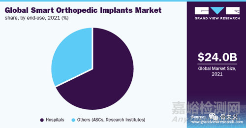 從智能骨科植入物的應(yīng)用來(lái)看,總體潛在市場(chǎng)可進(jìn)一步細(xì)分為膝關(guān)節(jié)、髖關(guān)節(jié)等。膝關(guān)節(jié)應(yīng)用領(lǐng)域在2021年主導(dǎo)了全球市場(chǎng),并將在整個(gè)預(yù)測(cè)年內(nèi)保持領(lǐng)先的市場(chǎng)地位。該細(xì)分市場(chǎng)在2021年占據(jù)了總收入的最大份額,超過(guò)47.00%。另一方面,估計(jì)髖關(guān)節(jié)應(yīng)用細(xì)分市場(chǎng)在預(yù)測(cè)年內(nèi)的增長(zhǎng)率最快。促成這一細(xì)分市場(chǎng)快速增長(zhǎng)的關(guān)鍵因素之一是膝關(guān)節(jié)和髖關(guān)節(jié)疾病患病率的升高。