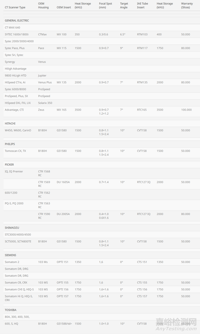 IAE是一家意大利企業(yè),歷史可追溯到1950年,從生產(chǎn)大功率電子管起家,1965年開始制造X射線管,現(xiàn)已發(fā)展成為歐洲最大的獨(dú)立旋轉(zhuǎn)陽極X射線管制造商,產(chǎn)品超過150款管芯/外殼組合,銷售遍及全球100個國家/地區(qū)。其生產(chǎn)的CT球管可用于GE、西門子、飛利浦(皮克)、佳能(東芝)、島津、日立。
