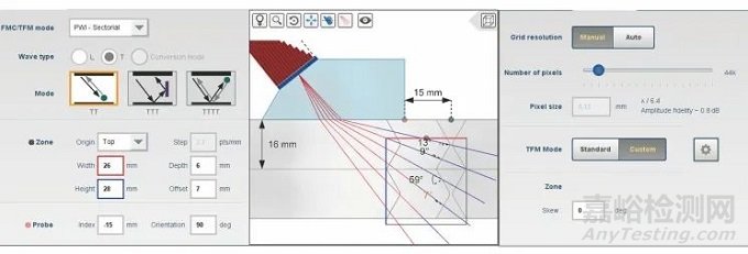 使用TFM進(jìn)行數(shù)據(jù)重建時(shí),需要進(jìn)行多組多模式設(shè)置,設(shè)置需要基于所用儀器的算法,不同儀器設(shè)置差別非常大。當(dāng)前便攜式儀器性能在面對多組TFM時(shí)仍要面臨相當(dāng)大的挑戰(zhàn),尤其焊縫厚度較大時(shí)可能需要對ROI進(jìn)行分區(qū)以便檢測可以正常實(shí)施。