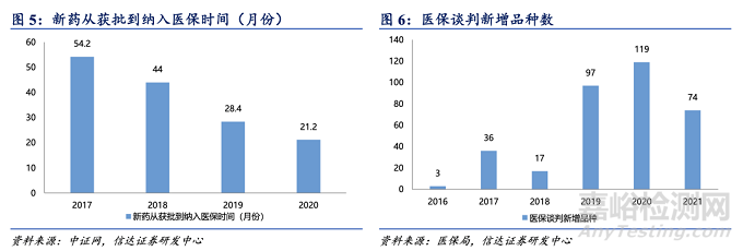 醫(yī)保目錄調(diào)整進(jìn)度加快。醫(yī)保是我國(guó)最大的醫(yī)療服務(wù)購(gòu)買方,進(jìn)入醫(yī)保目錄有助于大幅度加快藥品銷售放量速度。我國(guó)醫(yī)保目錄以前是每 5 年左右調(diào)整一次,醫(yī)保局成立后每 2 年調(diào)整一次,新產(chǎn)品進(jìn)入醫(yī)保目錄的頻率大幅度加快,有助于新產(chǎn)品快速放量,提升銷售額爬坡曲線,提高投資回報(bào)率。2016 起醫(yī)保部門直接與藥企談判,每年均有創(chuàng)新藥品通過(guò)談判進(jìn)入醫(yī)保,創(chuàng)新藥談判降低價(jià)格換取醫(yī)保報(bào)銷,通過(guò)以價(jià)換量進(jìn)一步加快了創(chuàng)新藥的放量速度。醫(yī)保新政助力創(chuàng)新藥放量。醫(yī)保目錄每 2 年一次動(dòng)態(tài)調(diào)整+每年 1 次醫(yī)保談判,加快了創(chuàng)新藥進(jìn)入醫(yī)保目錄的步伐。創(chuàng)新藥從獲批至進(jìn)入醫(yī)保目錄的平均時(shí)間從 2017 年的54.2個(gè)月縮短到2020 年的 21.2 個(gè)月, 時(shí)間逐漸縮短,臨床急需創(chuàng)新藥物加速納入醫(yī)保。通過(guò)醫(yī)保談判進(jìn)入醫(yī)保目錄的藥品數(shù)量也大幅度增加,有助于提高藥品投資回報(bào)率。