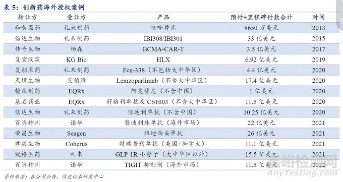 出海成為檢驗(yàn)創(chuàng)新藥的新標(biāo)準(zhǔn)。中國(guó)創(chuàng)新藥研發(fā)實(shí)力增加,將從國(guó)內(nèi)市場(chǎng)逐步走向全球市場(chǎng),研發(fā)出海是檢驗(yàn)創(chuàng)新藥含金量的新標(biāo)準(zhǔn)。海外技術(shù)授權(quán)、海外啟動(dòng)臨床、海外獲批上市、海外建立銷售渠道,難度從低到高。創(chuàng)新藥頭部企業(yè)的實(shí)力逐步得到認(rèn)可,邁向海外市場(chǎng)。海外授權(quán)方面典型案例是信達(dá)生物將單抗藥物 IBI308 和 IBI301 藥物海外權(quán)利授權(quán)禮來(lái),預(yù)付+里程碑付款合計(jì)共 33 億美元。