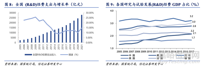 科研支出占 GDP 比例有望從 2.4%提升至 3%左右。2021 年我國(guó)研發(fā)支出 27956 億,占 GDP 的比重為 2.44%,比上年提高 0.03 個(gè)百分點(diǎn),已接近經(jīng)濟(jì)合作與發(fā)展組織(OECD) 國(guó)家疫情前 2.47%的平均水平,我國(guó)科技創(chuàng)新能力在 132 個(gè)經(jīng)濟(jì)體中位列第 12 位,較上年再提升 2 位,穩(wěn)居中等收入經(jīng)濟(jì)體首位。我們預(yù)計(jì)十四五期間科研投入比例會(huì)繼續(xù)穩(wěn)步提高,未來(lái)有望達(dá)到發(fā)達(dá)國(guó)家水平,即科研投入占 GDP 的比重達(dá)到 3%。