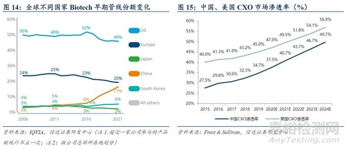 創(chuàng)新研發(fā)是 CXO 發(fā)展的核心動(dòng)能,Biotech 興起驅(qū)動(dòng) CXO 滲透率持續(xù)提升。從全球研發(fā)管線來(lái)看,Biotech 公司的后期管線數(shù)量及份額在過(guò)去 15 年中穩(wěn)步擴(kuò)大,2020 年占全球 后期研發(fā)管線總數(shù)的 64%,而大型制藥公司的份額則從 2005 年的 34%下降到 2020 年的 24%;從不同國(guó)家的研發(fā)管線來(lái)看,過(guò)去 15 年來(lái),總部設(shè)在中國(guó)的 biotech 公司的早期管線數(shù)量及份額上升明顯,2021 年全球占比為 17%,顯著高于 2011 年的 4%及 2016 年的 6%。綜合來(lái)看,Biotech 公司以及中國(guó)研發(fā)在全球所占的比重上升明顯,相較于大型藥企, Biotech 的人員、產(chǎn)能、經(jīng)驗(yàn)均有限,對(duì) CXO 的需求更高,研發(fā)趨勢(shì)的轉(zhuǎn)變帶來(lái)的高漲需求持續(xù)推動(dòng) CXO 行業(yè)發(fā)展,根據(jù) Frost & Sullivan,預(yù)計(jì)至 2024 年,中國(guó) CXO 市場(chǎng)滲透 率將達(dá)到 49.7%,美國(guó)將達(dá)到 56.9%,中美兩大醫(yī)藥市場(chǎng) CXO 滲透率呈逐年上升趨勢(shì), 中國(guó)上升速度更快。