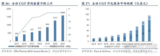以 CGT 為代表的新興技術(shù)的發(fā)展,持續(xù)拓寬 CXO 行業(yè)空間。細(xì)胞和基因療法(CGT) 也可廣泛的稱為基因療法,包括體外基因療法和體內(nèi)基因療法兩個(gè)類型?;虔煼ㄔ?20 世紀(jì)曾一度低迷,但是近幾年熱度逐漸攀升,據(jù) Informa Pharma Intelligence 統(tǒng)計(jì),2021 年全球 CGT 產(chǎn)品及管線數(shù)量達(dá)到 1589 項(xiàng),增速高達(dá) 24.8%,全球療法排名僅位于癌癥免疫治療和癌癥其他治療之后。急速增長(zhǎng)的產(chǎn)品管線及資金推升 CGT 行業(yè)發(fā)展,同時(shí)驅(qū)動(dòng) CGT CRO/CDMO 行業(yè)快速發(fā)展,F(xiàn)rost & Sullivan 預(yù)計(jì)到 2025 年,全球 CGT 外包服務(wù)市 場(chǎng)規(guī)模將達(dá) 96 億美元(CRO 17 億美元,CDMO 79 億美元),中國(guó) CGT 外包服務(wù)市場(chǎng)規(guī) 模將達(dá) 113 億元(CRO 12 億元,CDMO 107 億元),2022 至 2025 年預(yù)計(jì)復(fù)合增速約 150%。