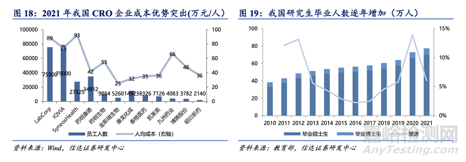 頂層設(shè)計(jì)助推發(fā)展,人才供應(yīng)保障行業(yè)高質(zhì)量、高速發(fā)展。國(guó)家政策層面積極鼓勵(lì)醫(yī)藥創(chuàng)新,積極出臺(tái)政策支持、引導(dǎo)外包行業(yè)發(fā)展,而集采的全面開(kāi)展也倒逼企業(yè)加大創(chuàng)新轉(zhuǎn)型,間接驅(qū)動(dòng) CXO 發(fā)展。此外,高質(zhì)量人才的充裕供給也是促進(jìn)行業(yè)快速發(fā)展的一大因素, 教育部數(shù)據(jù)顯示我國(guó)高等人才數(shù)量持續(xù)上升,2021 年我國(guó)共有 77.28 萬(wàn)畢業(yè)碩博生,同比增速高達(dá) 6.1%;通過(guò)對(duì)比國(guó)外 CXO 公司與國(guó)內(nèi) CXO 公司的人均成本,可以發(fā)現(xiàn)國(guó)外 CXO 公司的平均年人均成本約 85 萬(wàn)元,而國(guó)內(nèi)公司僅為 42 萬(wàn)元左右,該數(shù)據(jù)雖為對(duì)企業(yè)所有員工人均成本的計(jì)算,并未拆分技術(shù)、行政人員等,但也可以明顯看出國(guó)內(nèi) CXO 公司更具有成本優(yōu)勢(shì)。我們預(yù)計(jì),隨著我國(guó)人才數(shù)量的持續(xù)增加,工程師紅利將持續(xù)存在。