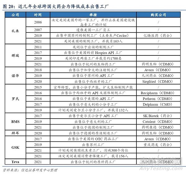 全球產(chǎn)業(yè)轉(zhuǎn)移助力產(chǎn)能突破,中國(guó)CXO全球供應(yīng)鏈地位逐步提升。原研藥品專利期過(guò)后,由于仿制藥的競(jìng)爭(zhēng),銷售額往往會(huì)“斷崖式下跌”,疊加各國(guó)對(duì)專利到期藥品的價(jià)格控制(如中國(guó)進(jìn)行全國(guó)藥品集中采購(gòu)),相關(guān)產(chǎn)品利潤(rùn)急劇降低,為了降低成本且聚焦創(chuàng)新研發(fā), 藥企剝離非核心產(chǎn)能,同時(shí)加強(qiáng)與 CXO 公司的合作。跨國(guó)藥企出售的工廠為蓬勃發(fā)展的 中國(guó) CXO 公司提供現(xiàn)成的產(chǎn)能,如九洲藥業(yè)在 2019 年收購(gòu)蘇州諾華、2021 年收購(gòu)杭州泰華,藥明生物 2021 年收購(gòu)輝瑞中國(guó)位于杭州的生物藥原液和制劑生產(chǎn)基地等,這些優(yōu) 質(zhì)產(chǎn)能解決了國(guó)內(nèi) CXO 公司的部分產(chǎn)能瓶頸,提升交付速度和質(zhì)量,全球產(chǎn)業(yè)鏈地位逐步提升。