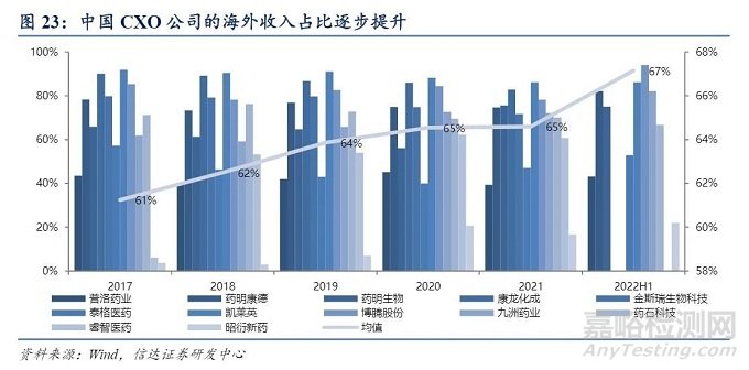 UVL 事件影響漸消,海外需求穩(wěn)定。在全球產(chǎn)業(yè)轉(zhuǎn)移的大趨勢(shì)下,中國(guó) CXO 行業(yè)是美國(guó) 創(chuàng)新藥產(chǎn)業(yè)鏈的重要一環(huán),跨國(guó)藥企的大型訂單對(duì)于中國(guó) CXO 公司的業(yè)績(jī)、供應(yīng)鏈地位 提升較大,因此 2022 年 2 月 8 日美國(guó)商務(wù)部將藥明生物無(wú)錫和上海子公司列入未經(jīng)核實(shí) 名單(UVL 名單)時(shí),引發(fā)了 CXO 行業(yè)對(duì)地緣政治緊張的恐慌。2022 年 10 月 7 日,經(jīng) 美國(guó)商務(wù)部現(xiàn)場(chǎng)訪問(wèn),藥明生物無(wú)錫子公司被移除 UVL 名單,疊加 9 月 29 日美國(guó)駐華大 使伯恩斯在新加坡第九屆米爾肯研究所亞洲峰會(huì)上呼吁中美對(duì)話,帶來(lái)中美關(guān)系緩和預(yù)期。截止至 2022H1,國(guó)內(nèi) CXO 海外收入占比逐步提升,海外需求穩(wěn)定。