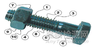 除螺紋外,影響螺栓疲勞性能的另外薄弱部位是螺紋與桿部的過渡處及螺栓頭部和桿部的過渡圓角處。由于截面的突然變化,在這些部位也存在較高的應(yīng)力集中。在此,我們列舉了影響螺栓疲勞特性的10大因素,請大家看下圖,以找到相應(yīng)的螺栓位置。