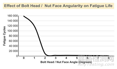 疲勞裂紋通常在螺紋底部開始萌生,可是也常常在螺頭底部開始。在螺頭底部開始萌生的裂紋通常產(chǎn)生的原因是螺頭過渡圓弧的直徑設(shè)計(jì)不當(dāng)造成的(不當(dāng)?shù)倪^渡圓弧直徑引來的應(yīng)力集中),或者是螺栓被安裝在了一個傾斜的加持物上。一個很小的螺栓頭部和加持物(也可以理解為螺母端面)的夾角,譬如:2度,會對疲勞強(qiáng)度有著難以估計(jì)的負(fù)面影響。這種現(xiàn)象在過去經(jīng)常發(fā)生在被加持物為焊接件上(焊接件在焊接后通常會發(fā)生應(yīng)力釋放,結(jié)構(gòu)形狀會發(fā)生變化)。