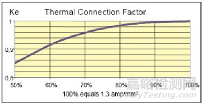 Ke:連接器件熱傳導系數(shù),按照每個回路的電流,按照1.3A/mm2為100%,參照圖七連接器件熱傳導系數(shù)曲線圖,得出的Ke數(shù)據(jù)見表三。