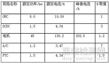 K:負載修正系數(shù),根據(jù)所在回路負載的不同,需增加一個放大系數(shù)K,對于阻性負載回路,K取1.5左右;對于容性負載回路,考慮到上電沖擊,K取2左右;電動壓縮機啟動瞬間峰值電流過大,K取7~8左右;對于驅(qū)動電機回路,K取1.2~1.5左右;此處K值取值見表二: