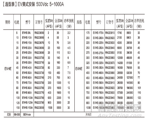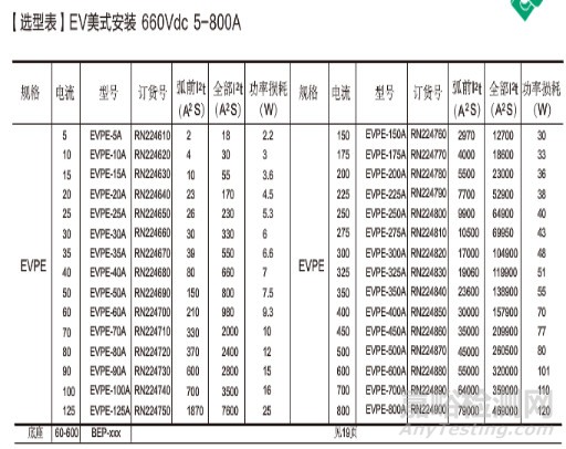 綜上所述,以友容陶瓷高壓熔斷器為藍本,從選型表得知,友容EVHE系列電壓等級為500VDC,EVPE系列及PEF16系列電壓等級為660VDC,均符合要求,查詢電流規(guī)格后各回路熔斷器選型如下:
