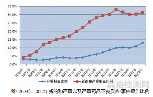 2022年全國藥品不良反應(yīng)監(jiān)測網(wǎng)絡(luò)收到嚴(yán)重藥品不良反應(yīng)事件報告26.4萬份,嚴(yán)重藥品不良反應(yīng)事件報告占同期報告總數(shù)的13.0%(圖2)。