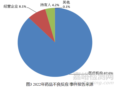 持有人、經(jīng)營企業(yè)和醫(yī)療機構(gòu)是藥品不良反應(yīng)報告的責(zé)任單位。按照報告來源統(tǒng)計,2022年來自醫(yī)療機構(gòu)的報告占87.6%、來自經(jīng)營企業(yè)的報告占8.1%、來自持有人的報告占4.2%、來自其他報告者的報告占0.1%(圖3)。