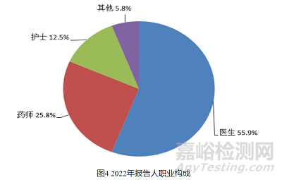 按照報告人職業(yè)統(tǒng)計,醫(yī)生占55.9%、藥師占25.8%、護士占12.5%、其他職業(yè)占5.8%(圖4) 。