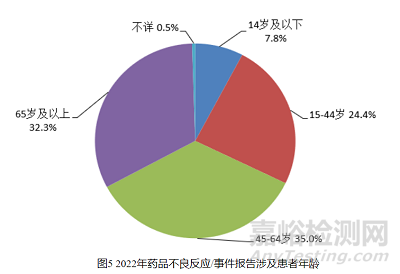 2022年藥品不良反應(yīng)/事件報告中,女性多于男性,性別比為0.87:1。從年齡分布看,14歲及以下兒童患者占7.8%,65歲及以上老年患者占32.3% (圖5)。