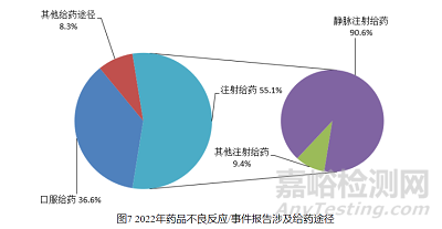 按照給藥途徑統(tǒng)計,2022年藥品不良反應(yīng) 事件報告中,注射給藥占55.1%、口服給藥占36.6%、其他給藥途徑占8.3%;注射給藥中靜脈注射給藥占90.6%、其他注射給藥占9.4% (圖7)。
