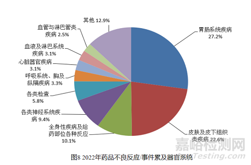 2022年報告的藥品不良反應(yīng)/事件中,累及器官系統(tǒng)排名前3位依次為胃腸系統(tǒng)疾病、皮膚及皮下組織類疾病、全身性疾病及給藥部位各種反應(yīng)(圖8)。