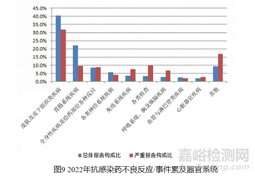 2022年抗感染藥不良反應(yīng)/事件報告中,總體報告和嚴(yán)重報告的藥品不良反應(yīng)/事件累及器官系統(tǒng)情況詳見圖9。與抗感染藥的總體報告相比,嚴(yán)重報告的全身性疾病及給藥部位各種反應(yīng),免疫系統(tǒng)疾病,各類檢查,呼吸系統(tǒng)、胸及縱隔疾病,心臟器官疾病構(gòu)成比偏高。