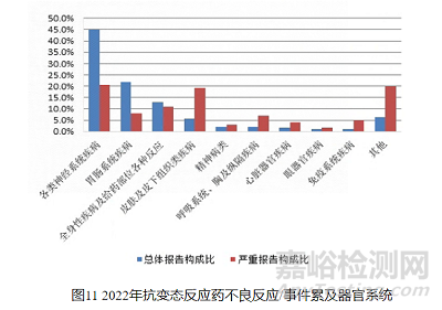 各種反應(yīng)、胃腸系統(tǒng)疾病、皮膚及皮下組織類疾病、精神病類??棺儜B(tài)反應(yīng)藥嚴(yán)重藥品不良反應(yīng)/事件報告中,口服制劑累及器官系統(tǒng)排名前5位是各類神經(jīng)系統(tǒng)疾病、皮膚及皮下組織類疾病、胃腸系統(tǒng)疾病、全身性疾病及給藥部位各種反應(yīng)、肝膽系統(tǒng)疾?。鹤⑸鋭├奂捌鞴傧到y(tǒng)排名前5位是各類神經(jīng)系統(tǒng)疾病,皮膚及皮下組織類疾病,全身性疾病及給藥部位各種反應(yīng),免疫系統(tǒng)疾病,呼吸系統(tǒng)、胸及縱隔疾病。