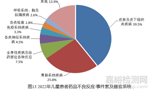 2022年兒童患者藥品不良反應(yīng)/事件報告中,累及系統(tǒng)排名前3位的是皮膚及皮下組織類疾病、胃腸系統(tǒng)疾病、全身性疾病及給藥部位各種反應(yīng)(圖13)。化學(xué)藥累及系統(tǒng)前3位的與總體一致,中成藥累及系統(tǒng)排名前3位的是胃腸系統(tǒng)疾病、皮膚及皮下組織類疾病、全身性疾病及給藥部位各種反應(yīng)。生物制品累及系統(tǒng)與整體排序有所差異,分別是各類檢查、全身性損害、皮膚及皮下組織類疾病。