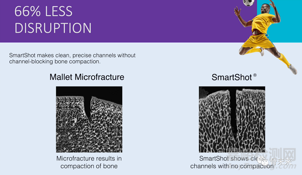 這是一種新穎、易于使用的設備,提供的骨髓通路是傳統(tǒng)微骨折治療方式的兩倍,同時對天然骨骼的破壞更少。使用SmartShot 設備在骨骼上打出的孔更干凈也更精確,與傳統(tǒng)微骨折方式相比,骨損傷減少66%。