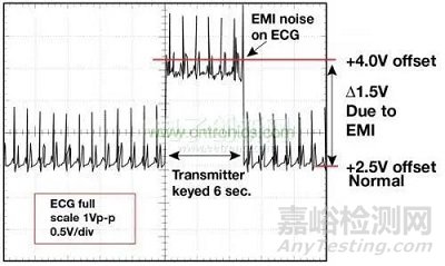圖1 1.5 英尺以外的發(fā)射器(f = 470 MHz, P= 0.5W)開啟和關(guān)閉時(shí)ECG 診斷設(shè)備的心臟檢查結(jié)果