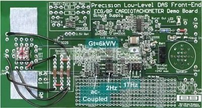 圖1中,系統(tǒng)的心臟輸入信號(hào)約為0.25 mVp-p。這種小信號(hào)要求有6000 V/V 左右的測(cè)量放大器增益。幸運(yùn)的是,圖1 所示情況并不代表醫(yī)用ECG 測(cè)量設(shè)備的實(shí)際性能。這種測(cè)量實(shí)際是使用圖2 所示電路板在工程師的實(shí)驗(yàn)室中進(jìn)行的。