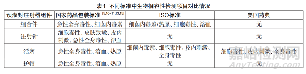 目前國內(nèi)外關(guān)于預(yù)灌封注射器不同部件所要進(jìn)行的生物相容性檢測項(xiàng)目有所不同。表1列舉出了國家藥品包裝標(biāo)準(zhǔn)、國際標(biāo)準(zhǔn)、美國藥典中生物相容性檢測項(xiàng)目的對比情況。