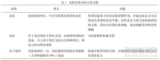 人體最大的器官就是皮膚,約占體重的15%,抵御外源性暴露的屏障特性和維持動(dòng)態(tài)平衡是皮膚的兩大主要功能。皮膚可分為表皮、真皮和皮下組織,是一個(gè)復(fù)雜的多層結(jié)構(gòu)體,盡管皮膚在整個(gè)身體結(jié)構(gòu)上是連續(xù)的,但根據(jù)個(gè)體的年齡和解剖部位不同,皮膚的厚度也會(huì)有所不同,皮膚各層的基本特點(diǎn)和功能見(jiàn)表1[3]。