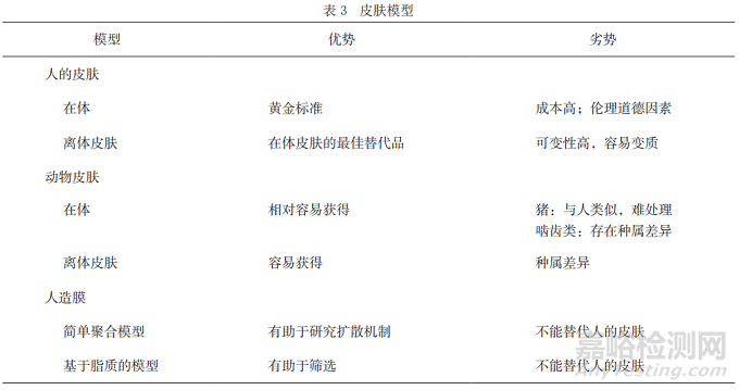 體外滲透是評(píng)價(jià)透皮貼劑的一個(gè)重要方面,如果藥物是為了給人類使用,體外滲透試驗(yàn)最合適的皮膚模型就是人體皮膚。但是,由于道德或者經(jīng)濟(jì)方面的原因,特別是在藥物研發(fā)的早期階段,這幾乎是不可能的。因此,找到與人類皮膚接近的代用品是非常必要的。表3[24]列出了一些常用于評(píng)價(jià)藥物體外滲透的皮膚模型。