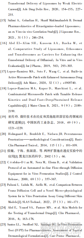 常用的物理促透方法包括電穿孔、離子導(dǎo)入法以及超聲導(dǎo)入法。電穿孔是通過(guò)電脈沖使細(xì)胞膜等脂質(zhì)雙分子層形成暫時(shí)、可逆的親水性孔道,藥物經(jīng)過(guò)孔道進(jìn)入皮膚而被吸收的技術(shù)[4];離子導(dǎo)入是通過(guò)電位差,使藥物通過(guò)電滲流移動(dòng),不破壞皮膚屏障[5];超聲導(dǎo)入法是指利用超聲波的能量使藥物透過(guò)皮膚,可實(shí)現(xiàn)在短時(shí)間內(nèi)增加藥物透皮吸收[6]。Vaidya等[7]自制了甲氨蝶呤貼劑,比較了甲氨蝶呤貼劑與3種物理促滲方法(超聲導(dǎo)入、電穿孔和冷激光)相結(jié)合后的滲透情況,依次是超聲導(dǎo)入>電穿孔>冷激光,相關(guān)藥效學(xué)試驗(yàn)也表明在類風(fēng)濕性關(guān)節(jié)炎的治療中,使用超聲導(dǎo)入作為促滲技術(shù)配合甲氨蝶呤貼劑有著更為顯著的效果。