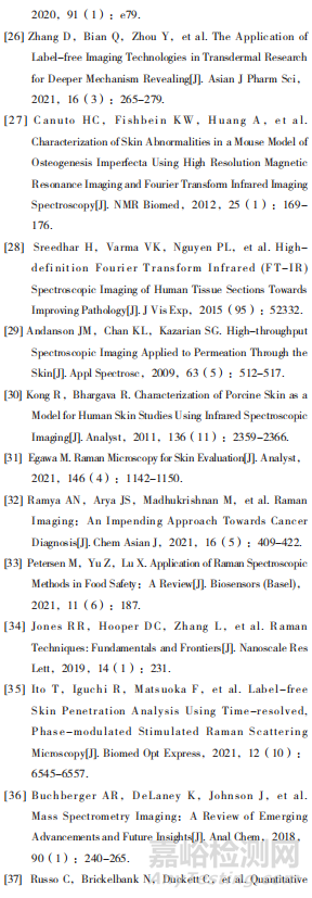 透皮貼劑在皮膚中的滲透行為不僅影響其滲透速率,還可以反映其安全性和有效性,然而相關(guān)的理論和試驗(yàn)并不能完整地反映滲透行為。利用成像技術(shù)可以獲得藥物經(jīng)皮吸收后在皮膚中的空間分布信息,以探索透皮增強(qiáng)機(jī)制,揭示局部藥物與皮膚相互作用的機(jī)理,幫助更好地了解透皮吸收這一動(dòng)態(tài)過(guò)程。但并不是所有的成像技術(shù)都可以用于分析透皮貼劑的體外滲透行為,例如熒光標(biāo)記雖然能夠追蹤待測(cè)物的動(dòng)態(tài)過(guò)程,但其熒光標(biāo)記的分子量通常遠(yuǎn)高于透皮貼劑藥物的分子量,并且熒光標(biāo)記不可避免地會(huì)改變待測(cè)物的動(dòng)態(tài)行為,對(duì)結(jié)果造成干擾;光聲成像、光學(xué)相干斷層掃描、高頻超聲成像等可以說(shuō)明皮膚形態(tài)結(jié)構(gòu),但不能對(duì)待測(cè)物進(jìn)行特征分析,目前用于分析透皮貼劑體外滲透行為的成像技術(shù)主要有紅外光譜、拉曼光譜以及質(zhì)譜成像[26]。