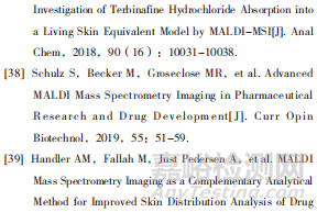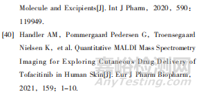 MALDI-MSI是一種能夠同時(shí)檢測(cè)多種化合物的成像技術(shù),應(yīng)用非常廣泛,據(jù)報(bào)道[39]已成功地應(yīng)用于分析藥物在豬皮的空間分布情況,同時(shí)可以比較作用于局部的藥物的滲透能力。當(dāng)MALDI-MSI應(yīng)用于透皮貼劑時(shí),皮膚作為定量試驗(yàn)的靶器官,組織成分對(duì)MSI信號(hào)響應(yīng)的影響具有重要意義。在透皮貼劑的研究中,可將Franz擴(kuò)散池與MALDIMSI技術(shù)結(jié)合來(lái)對(duì)滲透行為進(jìn)行分析,增加對(duì)皮膚、輔料和藥物分子之間復(fù)雜相互作用的理解,從而對(duì)透皮貼劑的體外滲透與體內(nèi)分布作出更加科學(xué)和全面的分析。Handler等[40]應(yīng)用Franz擴(kuò)散池法對(duì)3種處方的托法替尼進(jìn)行了體外滲透試驗(yàn),并用MALDI-MSI定量測(cè)定藥物在皮膚中的滲透性,為了解托法替尼在皮膚中的分布提供了有價(jià)值的信息。