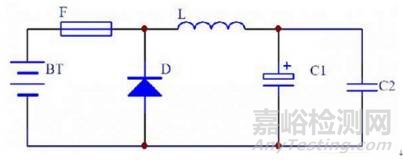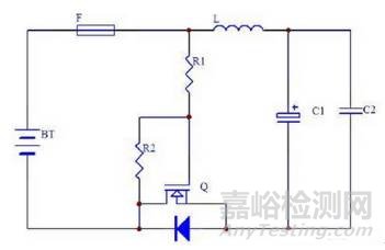 由圖可以看出,當(dāng)電池接反時(shí),肖特基二極管D導(dǎo)通,F(xiàn)被燒毀。如果后面是推挽結(jié)構(gòu)的主變換電路,兩推挽開關(guān)MOS管的寄生二極管的也相當(dāng)于和D并聯(lián),但壓降比肖特基大得多,耐瞬間電流的沖擊能力也低于肖特基二極管D,這樣就避免了大電流通過MOS管的寄生二極管,從而保護(hù)了兩推挽開關(guān)MOS管。