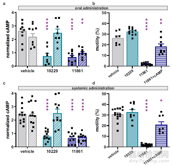 作者評(píng)估了雄性小鼠口服sAC抑制劑對(duì)體內(nèi)精子功能的影響。實(shí)驗(yàn)結(jié)果表明,長(zhǎng)停留時(shí)間抑制劑TDMI-11861處理的小鼠的精子對(duì)碳酸氫鹽仍然無(wú)反應(yīng),精子基本功能被抑制(圖3a)。接著,作者評(píng)估了口服sAC抑制劑對(duì)附睪尾精子運(yùn)動(dòng)的影響。實(shí)驗(yàn)結(jié)果顯示,口服TDI-11861治療的小鼠附睪中的精子基本喪失運(yùn)動(dòng)能力(圖3b),證實(shí)了該按需避孕策略的可行性。雄性小鼠通過(guò)單次口服長(zhǎng)停留時(shí)間的sAC抑制劑會(huì)嚴(yán)重阻斷cAMP介導(dǎo)的精子功能,并通過(guò)體外稀釋持續(xù)其作用。