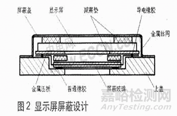 這里采用第三種方式,安裝時(shí)先將普通橡膠條粘在顯示窗內(nèi)壁四周,再將金屬絲網(wǎng)夾芯型玻璃粘在橡膠條上,同時(shí)用導(dǎo)電膠粘好金屬絲;然后用減震墊及金屬壓板將金屬絲網(wǎng)夾芯型玻璃壓緊,最后安裝顯示屏。安裝屏蔽玻璃時(shí),一定要將金屬絲網(wǎng)緊貼顯示窗內(nèi)壁,保證接觸處沒有縫隙,以防電磁泄漏。