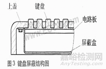 本終端鍵盤采用硅橡膠專用鍵盤,安裝在上蓋表面,開口較多,易引起電磁泄漏,降低屏蔽效能。因?yàn)榭卓p對(duì)電磁波的衰減與干擾波波長(zhǎng)及孔縫尺寸有關(guān),一般應(yīng)使孔洞的尺寸遠(yuǎn)小于電磁波的波長(zhǎng),只要孔縫的直徑足夠小,就能夠達(dá)到所要求的屏蔽效能。但一般按鍵的大小、排列應(yīng)符合人們的操作習(xí)慣,按鍵太小使用不方便,故這里主要采取安裝屏蔽罩的方法來減少電磁泄漏。鍵盤的屏蔽結(jié)構(gòu)設(shè)計(jì)如圖3所示。