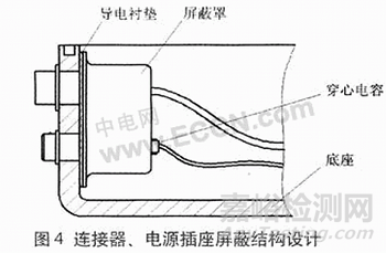 由于連接器與終端的接觸阻抗比較大,使得屏蔽電纜的共模傳導(dǎo)發(fā)射變大,為了防止由此引起的輻射超標(biāo),在連接器(插座)與底座以及屏蔽罩之間安裝導(dǎo)電襯墊,這種襯墊材料經(jīng)模切壓成,墊在連接器(插座)與屏蔽罩之間,具有良好的電接觸性能,能有效地控制該處縫隙泄漏。連接器、電源插座屏蔽結(jié)構(gòu)設(shè)計(jì)如圖4所示。