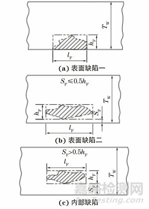 相控陣超聲檢測(cè)(PAUT)已廣泛應(yīng)用于海洋石油平臺(tái)的焊縫檢測(cè)中,對(duì)壓力管線焊縫進(jìn)行PAUT檢測(cè)時(shí),項(xiàng)目要求按照標(biāo)準(zhǔn)ASME B31.3-2020《工藝管道規(guī)范》附錄R進(jìn)行驗(yàn)收。這就需要對(duì)表面和內(nèi)部缺陷高度hF進(jìn)行準(zhǔn)確定量,表面和內(nèi)部缺陷高度如圖1所示(圖中TW為焊縫公稱厚度,lF為缺陷長度,SF為缺陷距表面距離)。然而,PAUT對(duì)缺陷高度測(cè)量的準(zhǔn)確性存在受多種因素影響的問題,為此,以典型的自身高度為2 mm缺陷為例,探究了聲束聚焦深度、探頭角度、檢驗(yàn)聲程等參數(shù)對(duì)碳鋼材料PAUT檢測(cè)中缺陷測(cè)高的影響。