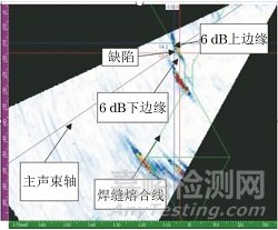 測(cè)量時(shí)首先通過扇形掃描視圖中找到缺陷的最高波幅,向上移動(dòng)角度指針,使回波高度降低至最高波幅的一半,該位置即為缺陷的上端點(diǎn);同理,向下移動(dòng)角度指針,使回波高度降低至最高波幅的一半,該位置即為缺陷的下端點(diǎn);上下端點(diǎn)的深度差(此時(shí)藍(lán)色和紅色測(cè)量光標(biāo)之間的距離)則為缺陷的高度值。