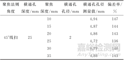 設(shè)置45°線性掃描,聚焦深度分別為10,15,20,25,30,35 mm,分別測(cè)量圖5中深度為25 mm的橫通孔高度,其結(jié)果如圖6所示。