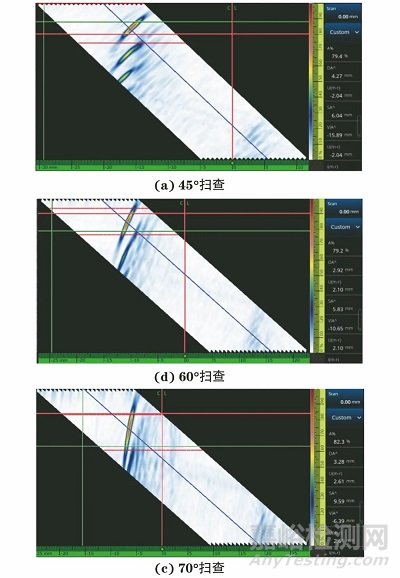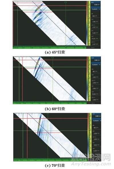 分別設(shè)置3組聚焦法則(45°,60°和70°線掃),3組法則均設(shè)置為非聚焦模式,除角度不一致外其他參數(shù)均相同。采用3組法則對(duì)圖4中聲程恒定式偏轉(zhuǎn)試塊的一組2 mm直徑橫通孔進(jìn)行檢測(cè),不同角度下橫通孔的高度測(cè)量結(jié)果如圖7所示。